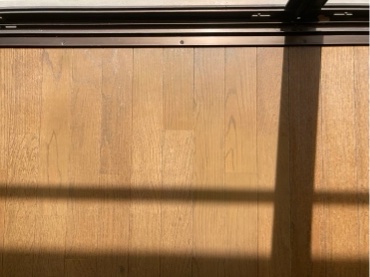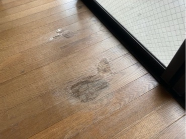 リビング掃き出し窓のフローリングが劣化し、シミができています。
