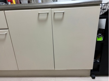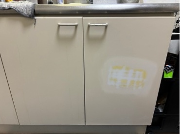 キッチン収納扉が凹んでヒビ割れています。