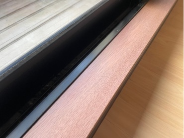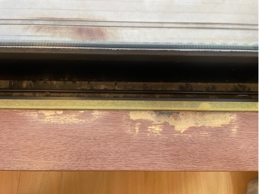 窓枠に貼られていたシールを剥がした際に、枠の表面が剥がれてしまっています。